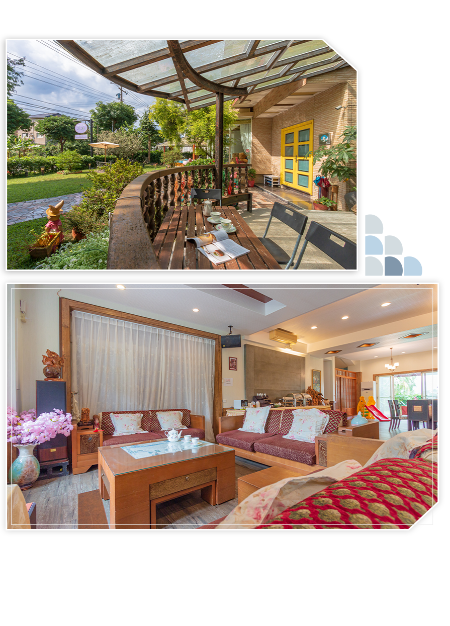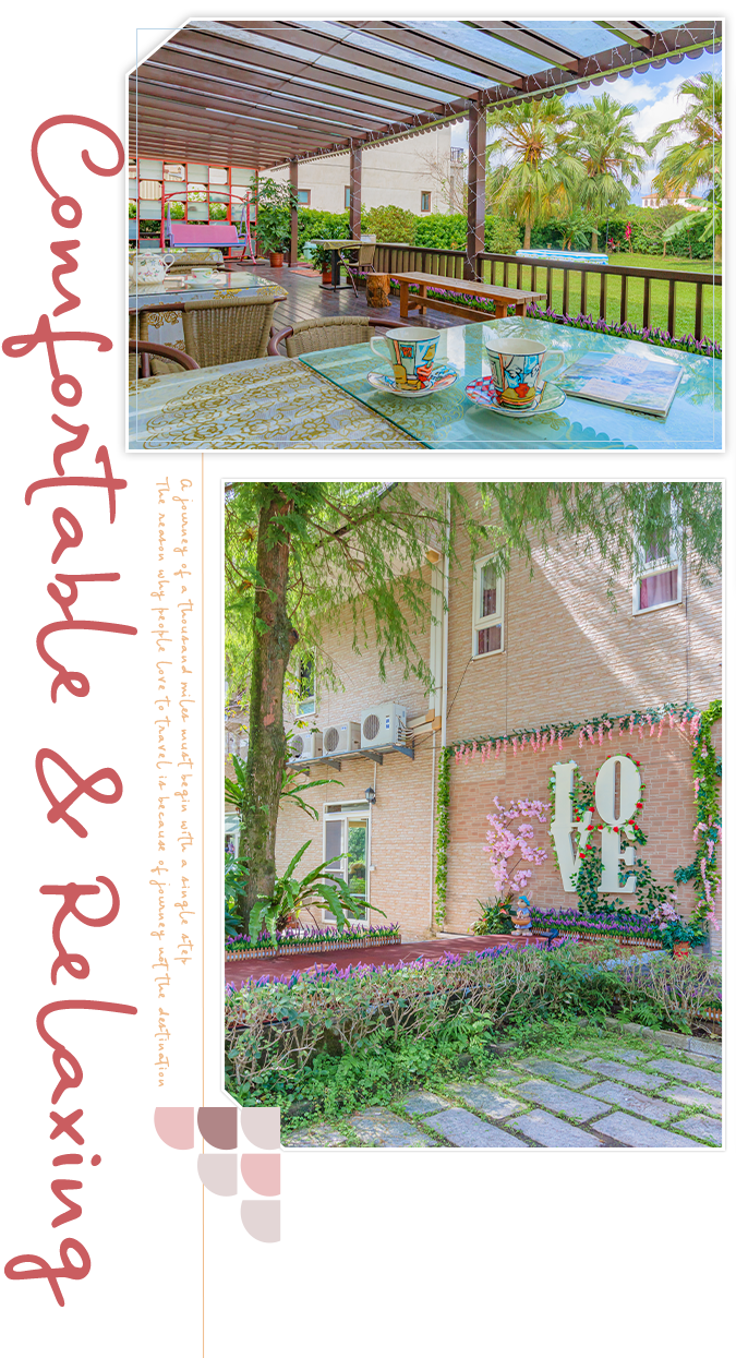 茂密的樹蔭,翠綠的草地,趁著晴空萬里,一個悠閒的午候,在戶外涼亭舉辦起一場下午茶會;午夜來臨,室內寬廣的客廳、砌茶區也都是您與家人談天說地的好地方;樸實是這的生活方式,雅緻是這的裝潢擺設,花檣民宿有著不輸飯店的服務與住宿品質,讓您在住宿的同時也能享受許多悠閒的休憩方式喔!